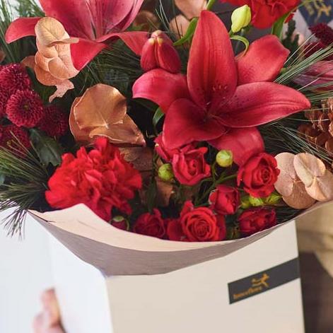 A beautiful bouquet of fresh festive flowers carefully chosen and arranged by a talented local florist.